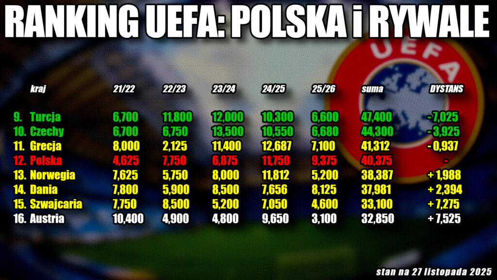 W rankingu UEFA utrzymujemy 12. miejsce i co istotne stopniała przewaga do 11. ligi w klasyfikacji, a więc Grecji. Tak obecnie wygląda klasyfikacja z dokładną rozpiską, ile tracimy do lig, które są przed nami.